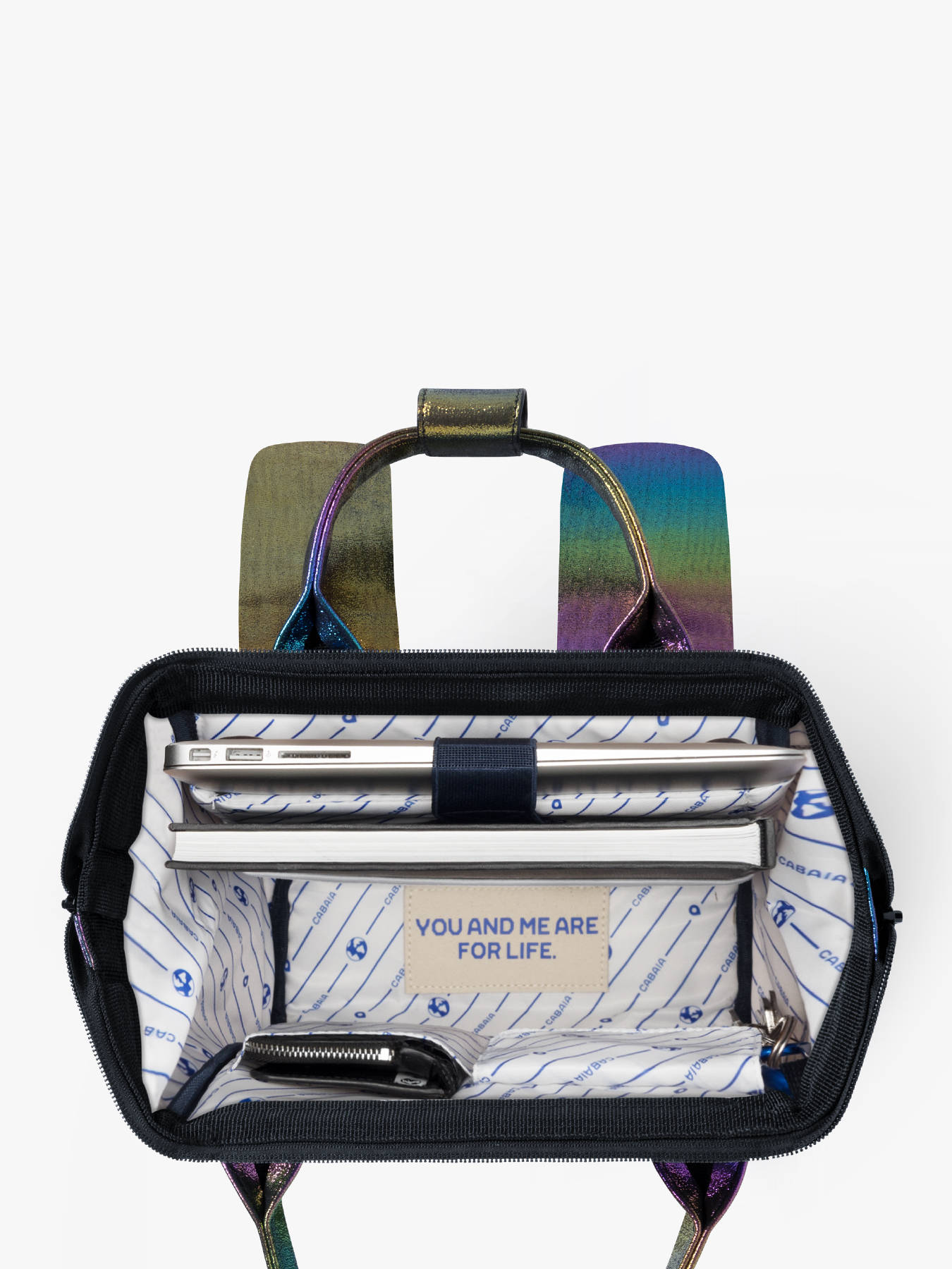 Adoptez le sac à dos vegan signé Cabaia ! Ce sac à dos Mini sera votre compagnon idéal, aussi bien pour les cours que pour voyager. On craque pour sa poche frontale amovible et interchangeable. Réalisé à partir de Nylon 900D la toile est très résistante. Ce sac à dos ados dispose d'une ouverture ""cabas"" grand angle donnant accès à un grand compartiment principal pouvant contenir un Ipad (hauteur 28 cm x largeur 21 cm x épaisseur 2 cm) à ranger dans la poche renforcée et du format cahiers A4. Très pratique, ce sac à dos sera également parfait pour transporter vos affaires lors d'un weekend, comme 1 jeans, 2 tee shirt, des sous-vêtements, une trousse de toilette et une tablette. Pour plus de confort et résistance, le fond est renforcé, le dos est rembourré et les bretelles sont molletonnées et anti-transpirantes. Au dos du sac, une poche zippée a été prévue pour ranger les petits effets personnels. Il y a également au dos une poche zippée spéciale pour glisser son téléphone portable ! On retrouve, sur le devant du sac à dos jeune un système de poche inviolable et breveté (système MOLLE) qui vous permet de personnaliser votre sac selon vos goûts. Deux poches zippées interchangeables sont fournies avec le sac à dos. Vous pouvez également ajouter des petites pochettes amovibles sur les côtés pour le personnaliser !